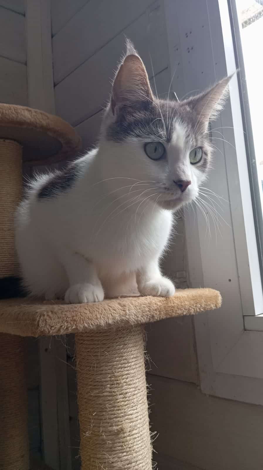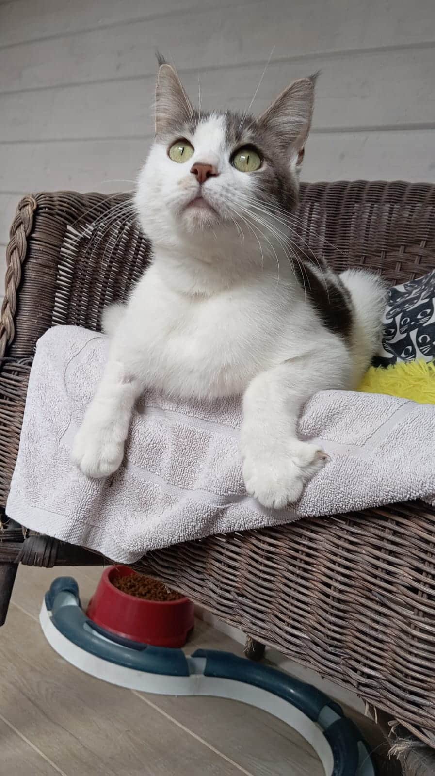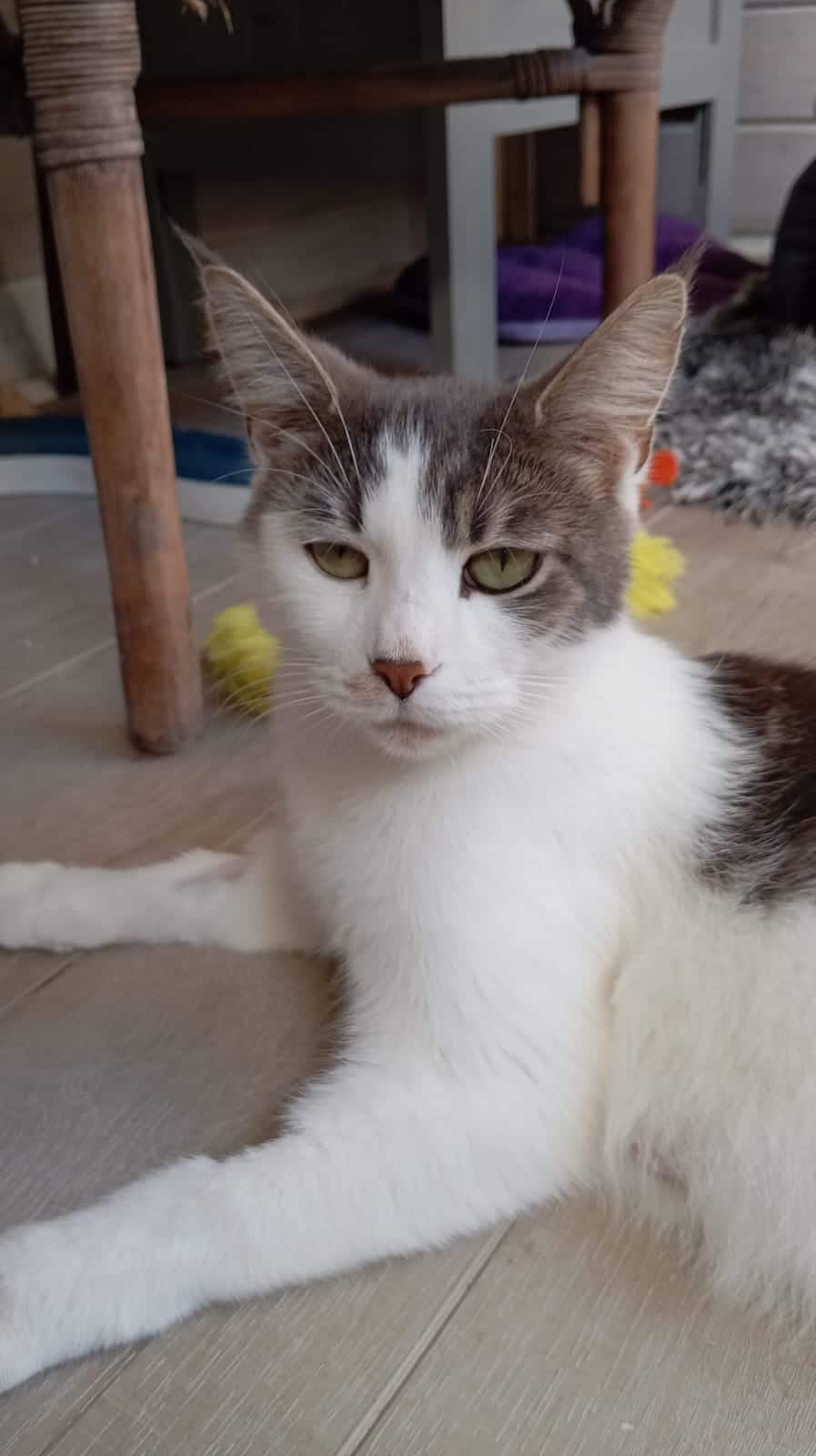 C’est une petite chatte douce et très affectueuse. Elle aime être sur les genoux, dans les bras et surtout proche de l’humain. C’est une minette joueuse et aussi très gourmande. Elle ronronner enormément lors des séances de câlins dont elle raffole.