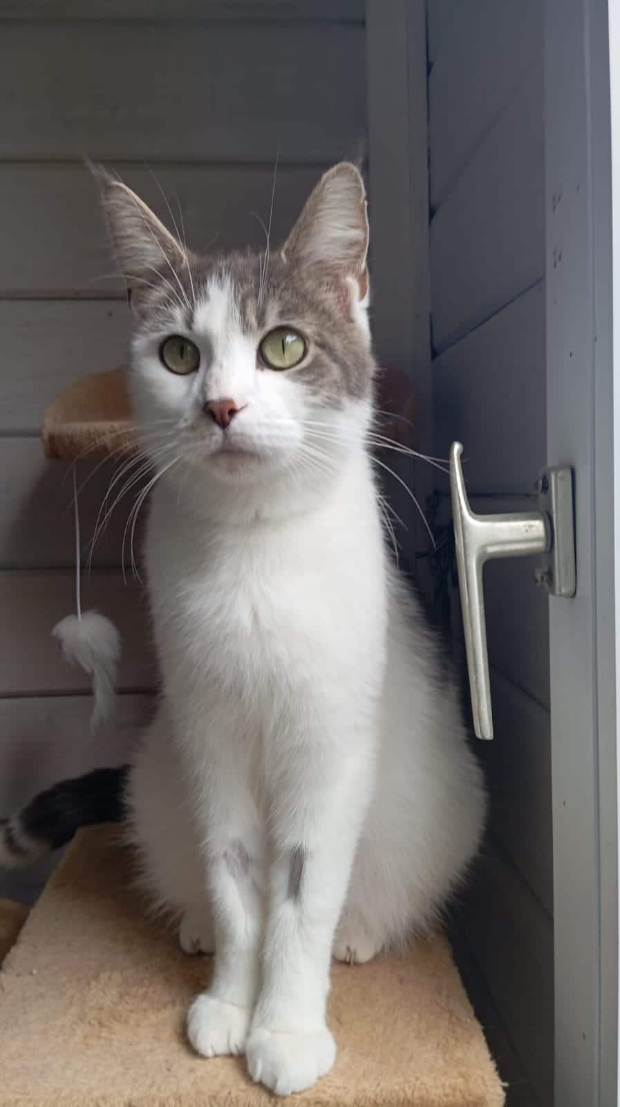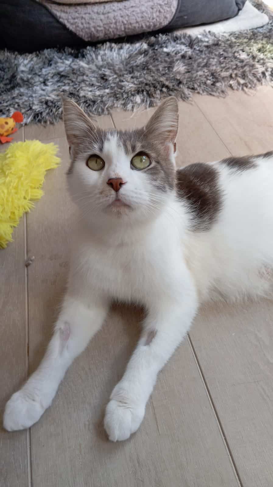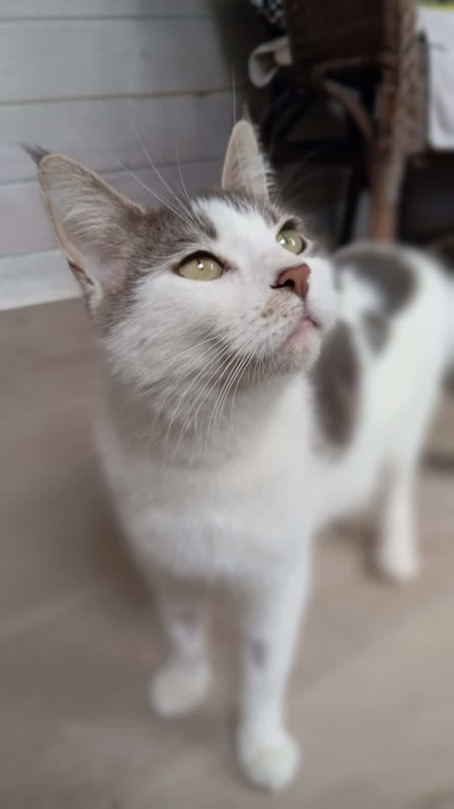 C’est une petite chatte douce et très affectueuse. Elle aime être sur les genoux, dans les bras et surtout proche de l’humain. C’est une minette joueuse et aussi très gourmande. Elle ronronner enormément lors des séances de câlins dont elle raffole.